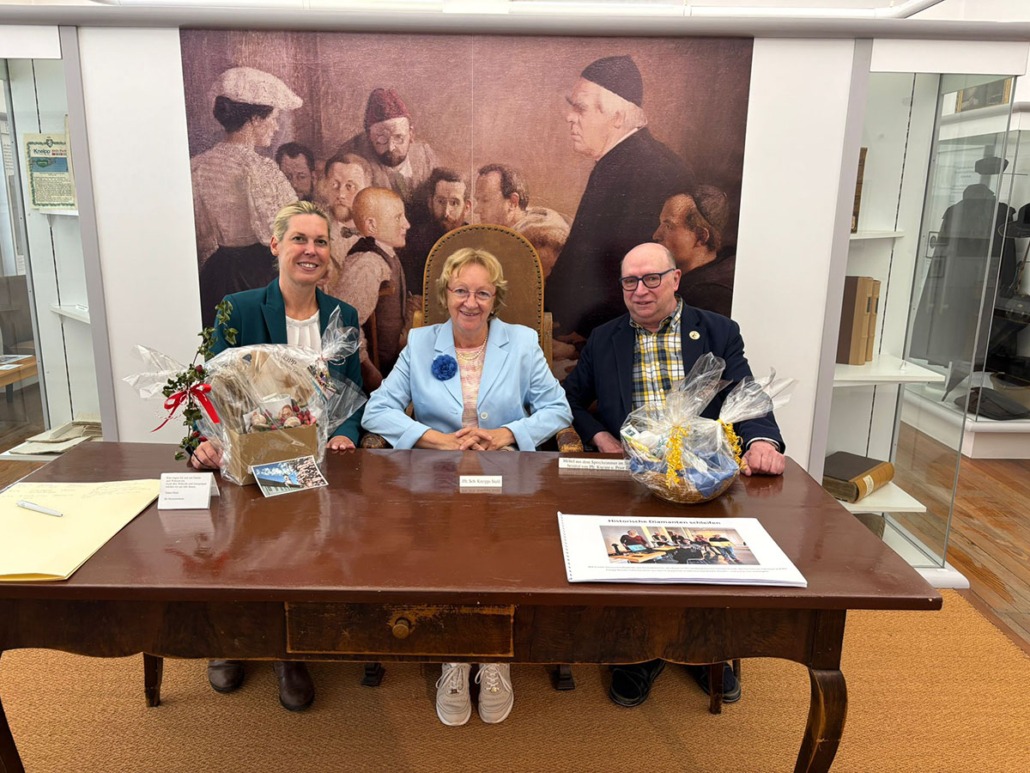 Kurdirektorin Cathrin Herd, die Jubilarin Frau Agnes Assmann und der Vorsitzende des Fördervereins, Werner Büchele sitzen am Original Tisch von Sebastian Kneipp an dem er seinerzeit im Sebastianeum seine Sprechstunden abhielt.